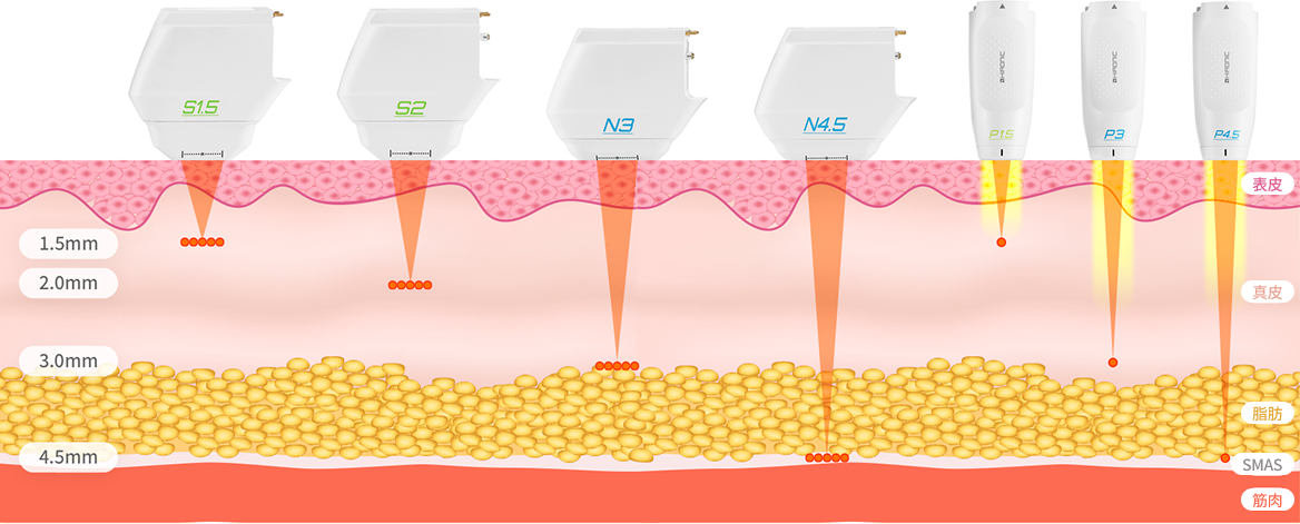 合わせてカートリッジを選択できます。皮膚層や脂肪層などさまざまな深さにエネルギーを届け、