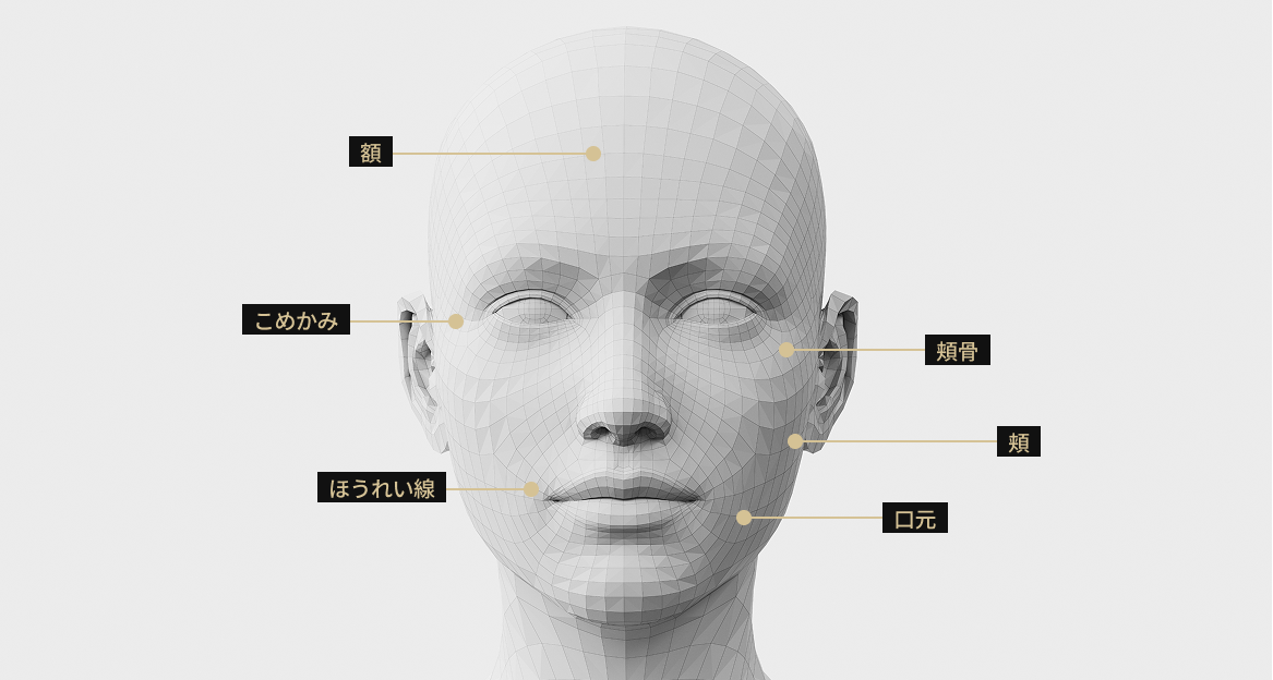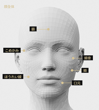 こめかみ、前頬、前頬骨、ほうれい線、口元、側頬など、広範囲への施術に適しています。